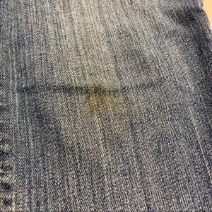 Other than a stain on the knee (picture included) there are no stains, tears, fraying or flaws except manufacturer distress.
