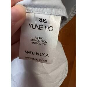 This Yune Ho women’s cotton blouse blends minimal elegance with subtle feminine details. Crafted in a soft light blue cotton, this top features a classic crew neckline, delicate ruffle short sleeves, and a full button-back closure for added sophistication. The structured yet breathable design makes it ideal for both office wear and polished casual looks.