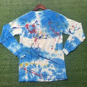 . This eye-catching shirt features a vibrant blue tie-dye pattern as the base, adorned with a playful and artistic array of colorful paint splatters in red, yellow, and purple, offering a one-of-a-kind aesthetic that is sure to stand out. Crafted with comfort in mind, the shirt boasts a soft, breathable fabric that is perfect for all-day wear. The long sleeve design provides a classic fit that's both comfortable and stylish, making it an excellent choice for a variety of occasions, from casual outings to creative events. Each shirt is unique due to the handcrafted nature of the dye and paint application, reflecting your individuality with every pattern variation.