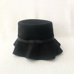 No size indicated. Collaboration with Yunotme and Pamplemousse first seen in 2018. Style name Alice. Black felt pleated brim structured hat with ribbon trim. Preowned. Pleating can be reshaped throughout and is not in the original shape when first released (from having been in storage. Small piece of the moldable trim insdie brim peaking out. Ribbon trim slightly loose.