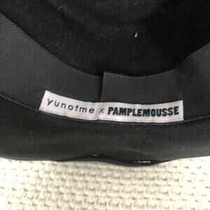 No size or content tag indicated. Just brand tag available. Collaboration with Yunotme and pamplemousse. Black wide brim wool material like hat with ribbon trim.