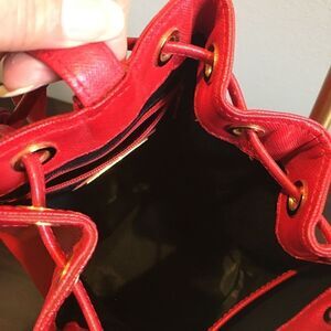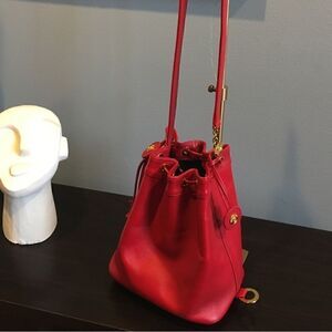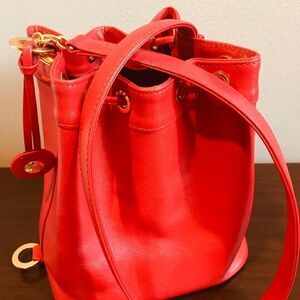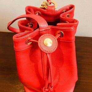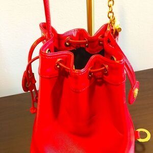Beautiful red Yurie bucket bag with gold tone hardware measuring 7.5 x 5 x 9”. Clean in very good used condition, with two interior pockets and plenty of Inter room.