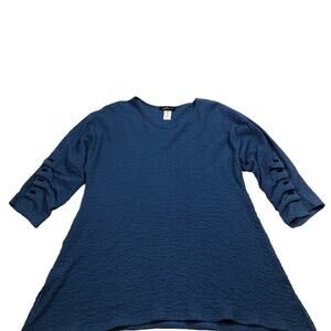 Scoop neck tunic made of a rayon blend , 3/4 sleeves with beaded cascade accent , crinkle material