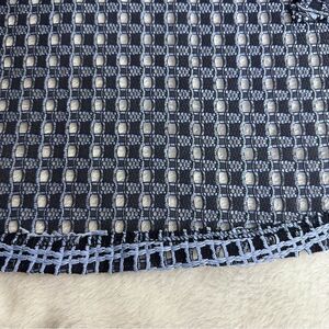 Yushi navy and periwinkle blue cowl neck elbow sleeve top. Open weave crochet style unlined, zippers on sleeves. Excellent preowned condition. See pics for care tags and approximate measurements.