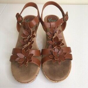 Yuu Roonie Tan Cork Wedge T Strap Flower Detail Open Toe Sandal Women Size 9