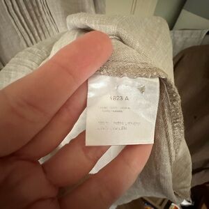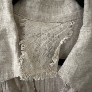 Stylish natural linen button-up shirt with a classic collar. Features pintucks on the front and back and long sleeves. Perfect for breezy casual outings.