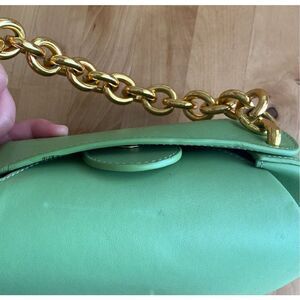 Green leather shoulder bag. Magnetic button closure. Open pockets. 9.5" W x 5"H x 5"D. Imported.