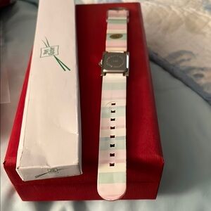 Stylish Yves Rocher watch with a multicolor striped band. Square face design. Perfect for any occasion. NWOT in box.