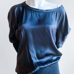Blouson top with a knit bottom. Material tag has been removed; only 2 piece of thread where the tag used to be, remain.