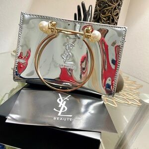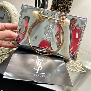 Chic Yves Saint Laurent silver clutch bag with black exterior. Stylish and versatile. Perfect on party and dress nights wedding