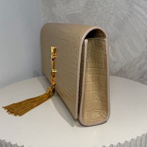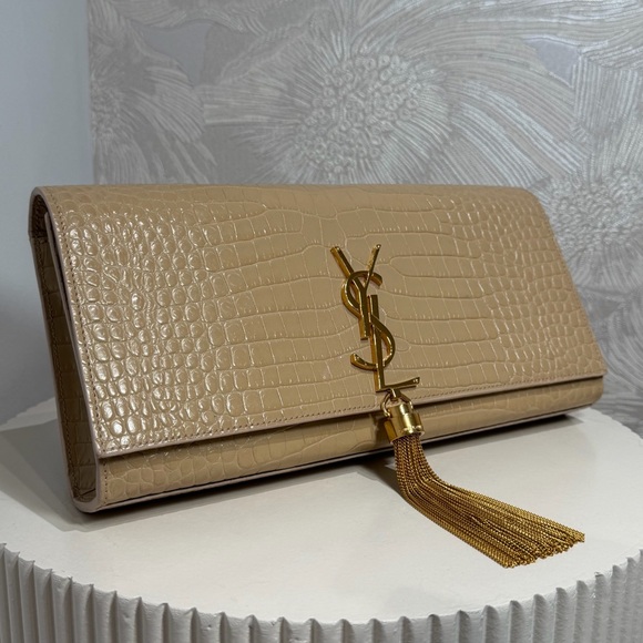This stunning Saint Laurent Monogram Tassel Clutch is a timeless statement piece, crafted in luxurious croc-embossed leather with a refined beige/nude finish. Elegant and sophisticated, it features the iconic YSL gold-tone logo accented with a delicate chain tassel, adding a touch of glamour to any look.
