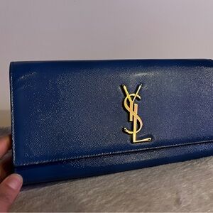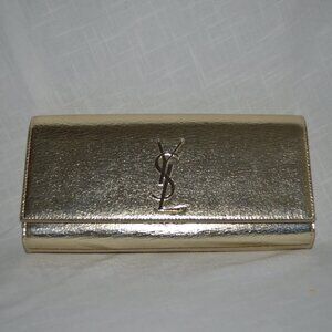 Chic Yves Saint Laurent clutch in beige leather. Features iconic gold logo. Ideal for stylish outings. No original box, has small indention you can barely see on the front right. Used a handful of times. Order now to get it before Christmas!