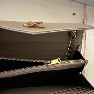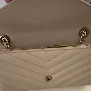 Elegant YSL wallet in quilted beige leather. Features signature gold logo. Perfect for any occasion.