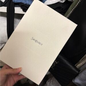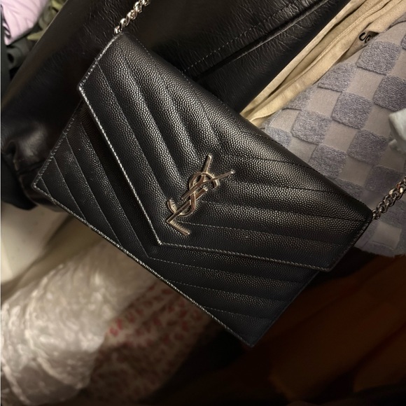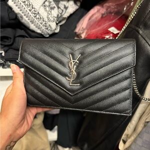 Chic black leather with chevron pattern. Iconic YSL logo in silver. Sleek wristlet design.