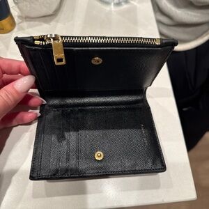Luxurious black chevron design. Features iconic YSL logo in gold. Perfect for chic style.