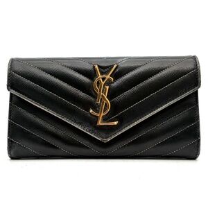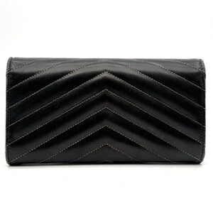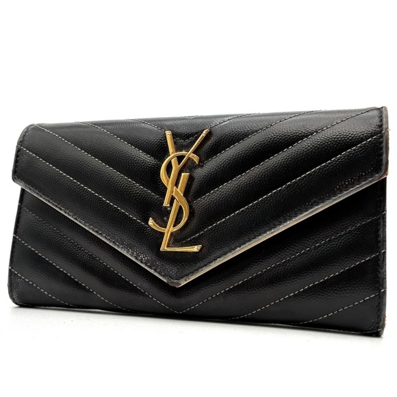 Elegant black wallet featuring a gold YSL emblem. Chevron pattern enhances style. Ideal for sophisticated occasions.