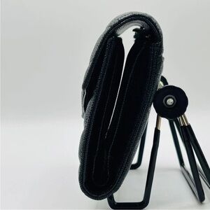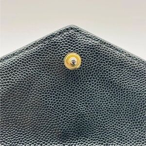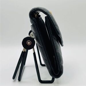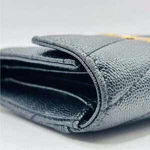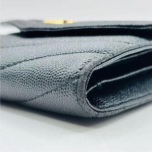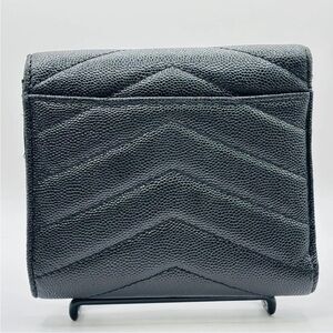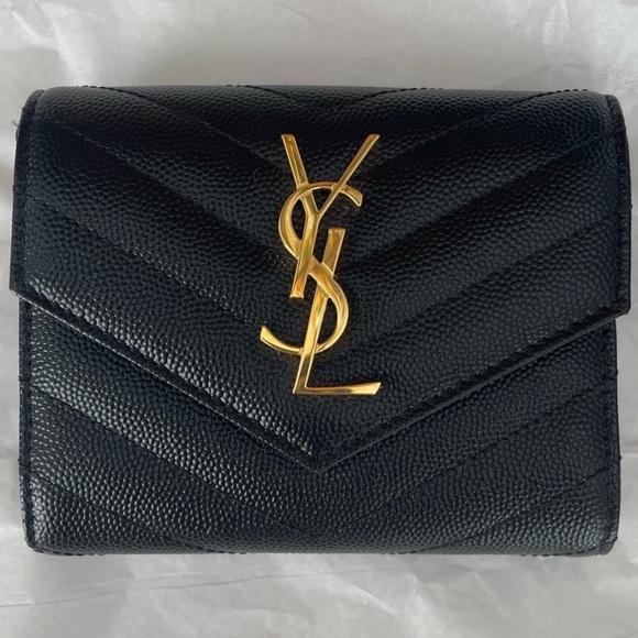 Chic black wallet with chevron pattern. Features iconic gold YSL logo. Compact and stylish.