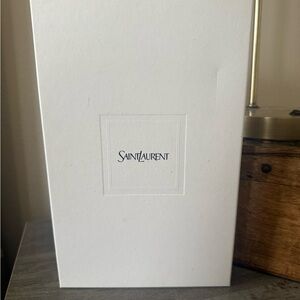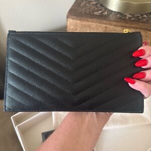 Elegant black wristlet with chevron design. Features gold YSL emblem. Ideal for stylish events.