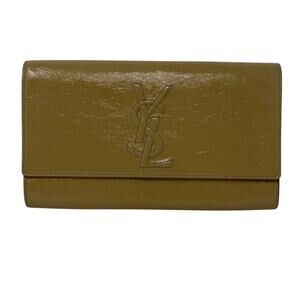 Elegant black clutch with iconic YSL logo. Sleek and stylish design. Perfect for any occasion.