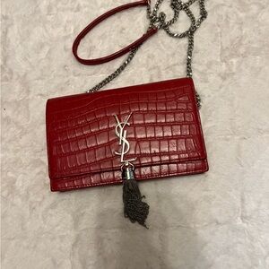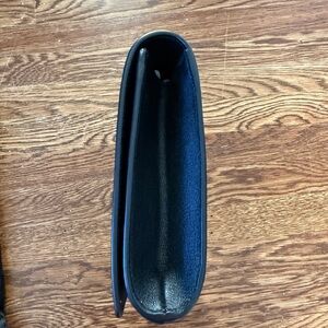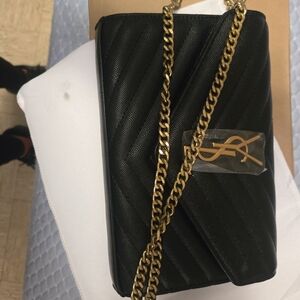 Elegant black clutch with embossed YSL logo. Sleek and stylish design. Perfect for any occasion. Worn once. Length: 11 in