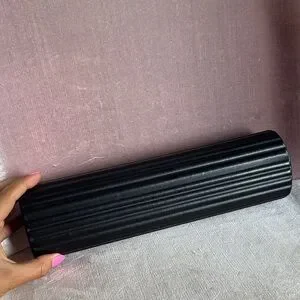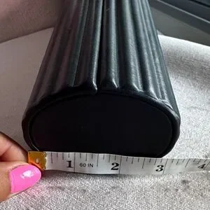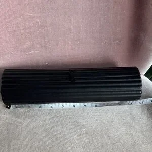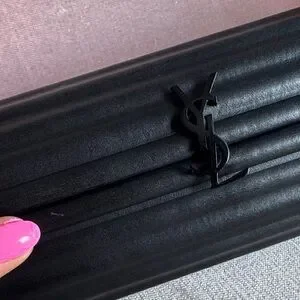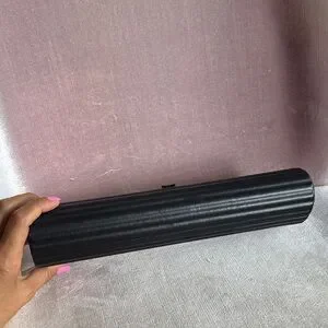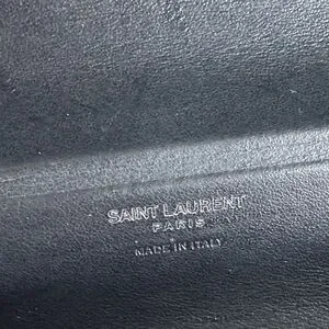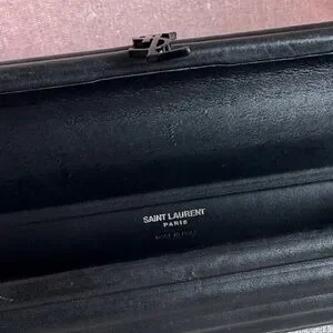 Elegant black clutch with ribbed texture. Features iconic YSL logo. Perfect for evening events.