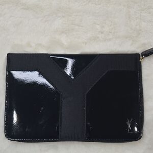 Elegant black clutch with signature Y design. Sleek and stylish. Perfect for any occasion.