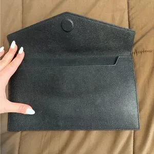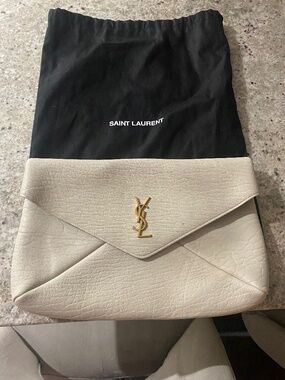 Elegant black clutch. Features iconic gold YSL logo. Perfect for evening wear.