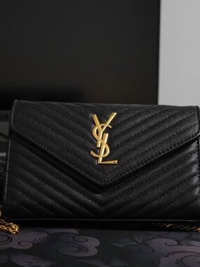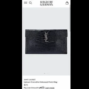 Elegant black croc-embossed clutch. Features iconic YSL logo in silver. Perfect for evening outings.