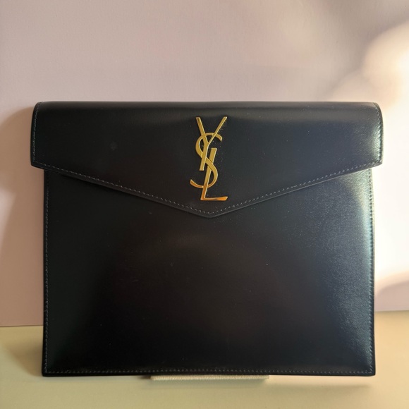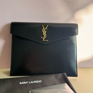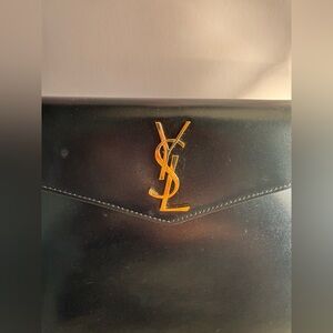 Classic and timeless Saint Laurent (YSL) black leather envelope clutch with iconic gold YSL logo. A sleek, minimalist piece that elevates any outfit—perfect for evenings, events, weddings, or chic everyday wear.