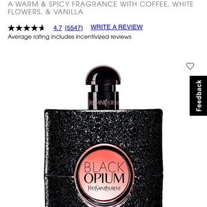 Yves Saint Laurent Black Opium. Features a bold pink and black bottle. Warm, spicy scent with coffee and floral notes. New! Still in box and plastic wrap.