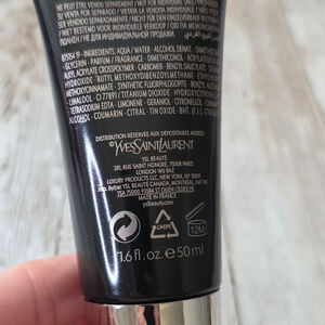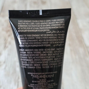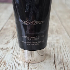 This is a new, without tags or box, Yves Saint Laurent Black Opium Shimmering Moisture Fluid for the body. The container is a black tube with silver accents and the YSL logo. The tube is 1.6 fl. oz. / 50 ml. The product is described as a shimmering moisture fluid. There are no visible imperfections.