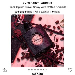 Indulge in the alluring scent of Black Opium by Yves Saint Laurent. This travel spray offers a blend of coffee and vanilla. Perfect for a touch of elegance on the go