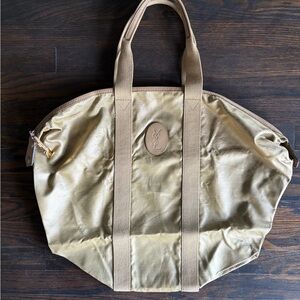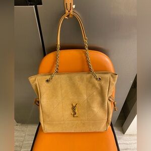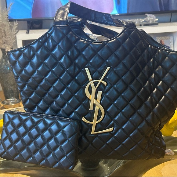 Chic black quilted tote by Yves Saint Laurent. Features a striking gold logo. Comes with a matching pouch. Perfect for stylish outings.