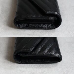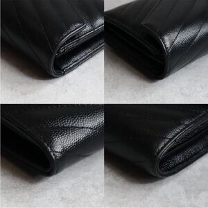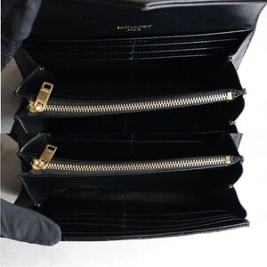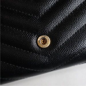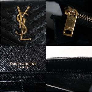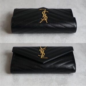 Chic black wallet with quilted texture. Features iconic gold YSL logo. Perfect for adding luxury to your style.