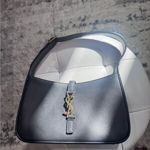 Chic black shoulder bag featuring iconic gold YSL logo. Sleek and stylish design.