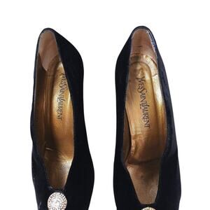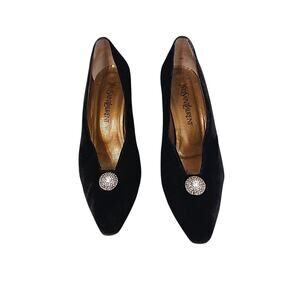 The Yves Saint Laurent Black Velvet Jeweled Pointed Toe Heels in size 9.5 are a stunning pair of vintage pumps perfect for formal occasions like parties, weddings, or even a fancy gala event.