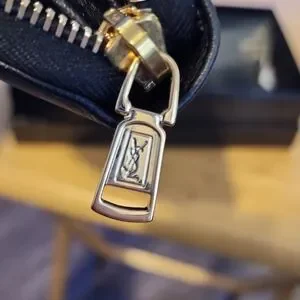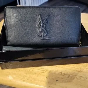 Elegant black wallet with embossed YSL logo. Sleek and stylish design. Perfect for any occasion. Beautiful sof leather.