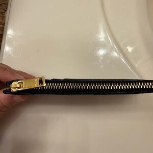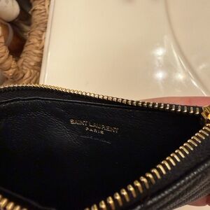 Authentic. Elegant black wallet. Features iconic gold YSL logo. Perfect for any occasion.