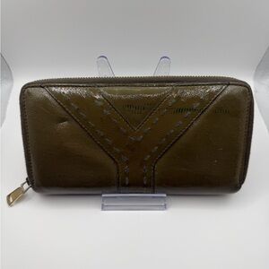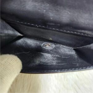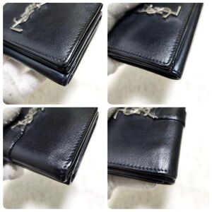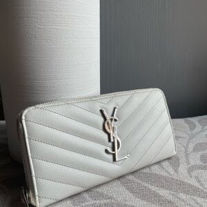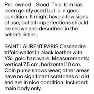 Elegant black wallet. Features iconic silver YSL logo. Compact and stylish design.