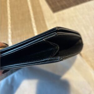 Chic black clutch with elegant gold accents. Perfect for evening wear. Sleek and stylish design.