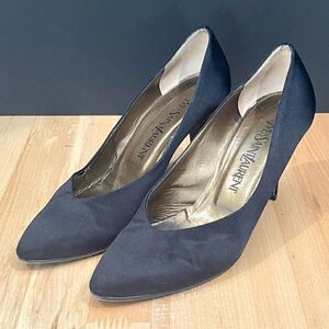 Elegant black heels with iconic gold YSL logo heel. Sleek ankle strap design. Perfect for evening wear.