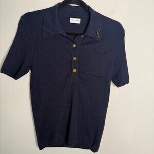 Yves Saint Laurent Blue Vintage Quarter Button Logo Pin Polo Short Sleeve authen