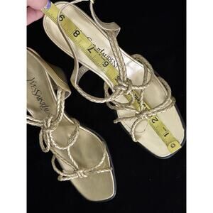 Yves Saint Laurent Braided Leather Gold Chunky Heel Open Toe Sandal 7.5. Condition is Pre-owned - Excellent. Shipped with USPS Ground Advantage.