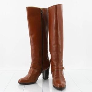 These knee-high heeled boots feature a rich warm brown color and are crafted from smooth leather with a slight sheen. The thick sturdy heel provides a stylish lift while the rounded toe offers a classic silhouette.
