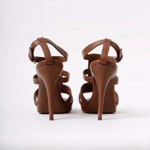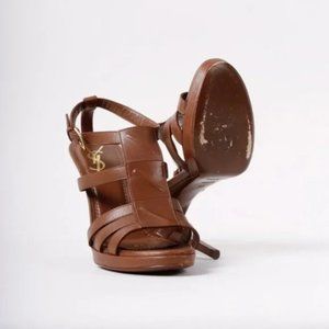 Strappy stiletto sandals from the house of Yves Saint Laurent in smooth milk chocolate brown calfskin leather featuring a matte gold-tone buckle ankle closure, a low platform, and “\” embossing down the vamp with a “Y” embossed on the left foot.