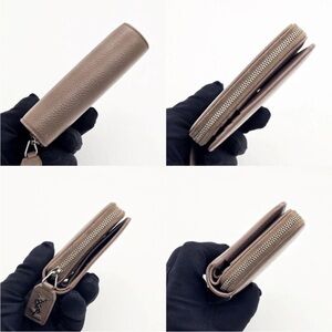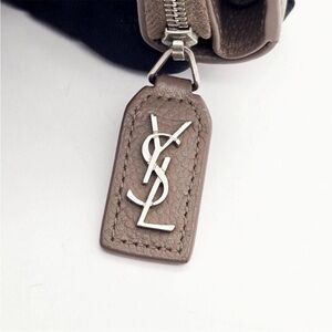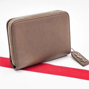 Elegant brown leather wallet. Features YSL logo tag. Compact and stylish design.