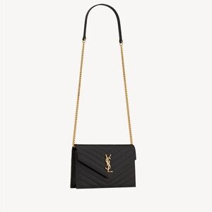 Chic black chevron design. Features iconic gold YSL logo. Stylish gold chain strap.