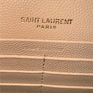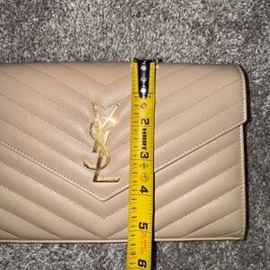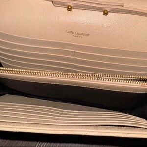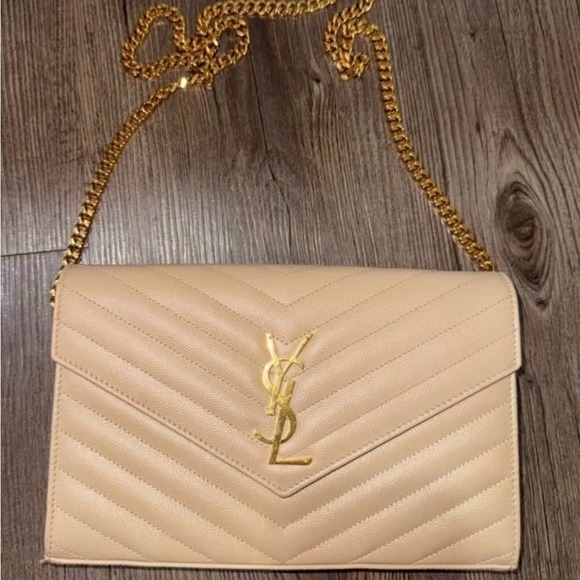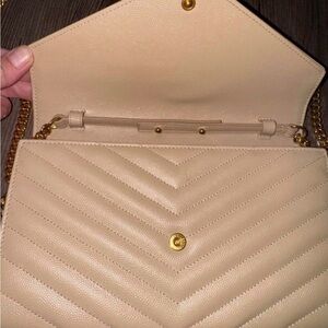 Chic authentic Yves Saint Laurent crossbody bag. Cream quilted leather with gold chain strap. Iconic YSL logo detail.