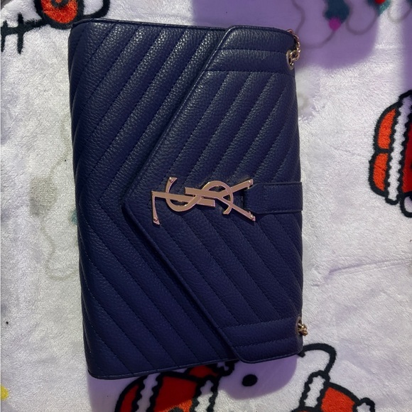 Chic dark blue quilted clutch with iconic YSL logo. Sleek and stylish design.
