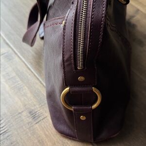 Elegant dark brown leather satchel. Gold hardware accents. Dual handles with a sleek design.